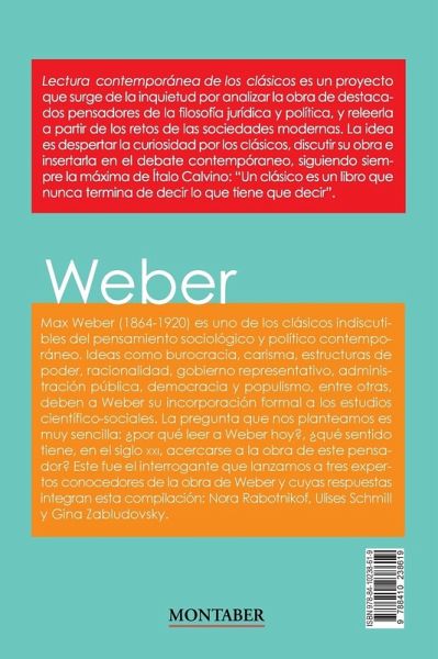Max Weber (1864-1920) es uno de los clásicos indiscutibles del pensamiento sociológico y político contemporáneo. Ideas como burocracia, carisma, estructuras de poder, racionalidad, gobierno representativo, administración pública, democracia y populismo, entre otras, deben a Weber su incorporación formal a los estudios científico-sociales. La pregunta que nos planteamos es muy sencilla: ¿por qué leer a Weber hoy?, ¿Qué sentido tiene, en los albores del siglo XXI, acercarse a la obra de este pensador? Ésta fue la interrogante que lanzamos a tres agudos conocedores de la obra de Weber y cuyas respuestas integran esta compilación: Nora Rabotnikof, Ulises Schmill y Gina Zabludovsky.