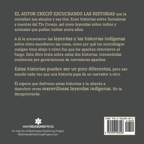 The author grew up listening to stories told by his grandparents and aunts and uncles. They were ghost and Br'er Rabbit stories, tall tales, and legends about Indians and animals that could talk to each other. He fell in love with legends and native stories of how things happened, like, why bats hang upside down and how the Apache people got fire. This book is about those two stories passed down orally from generations of Apache storytellers. His stories may be slightly different, but that happens every time a story is passed to another storyteller. He hopes you enjoy these stories, and they encourage you to find other wonderful native legends. You won't be disappointed. El autor creció escuchando las historias que le contaban sus abuelos y sus tíos. Eran historias sobre fantasmas y cuentos del Tío Conejo, así como leyendas sobre indios y animales que podían hablar entre ellos. A él le encantaron las leyendas y las historias indígenas sobre cómo sucedieron las cosas, como por qué los murciélagos cuelgan boca abajo y cómo fue que los apaches obtuvieron el fuego. Este libro trata sobre estas dos historias, transmitidas oralmente por generaciones de narradores apaches. Estas historias pueden ser un poco diferentes, pero eso sucede cada vez que una historia pasa de un narrador a otro. Él espera que disfrutes estas historias y te alienta a descubrir otras maravillosas leyendas indígenas. No te decepcionarás.