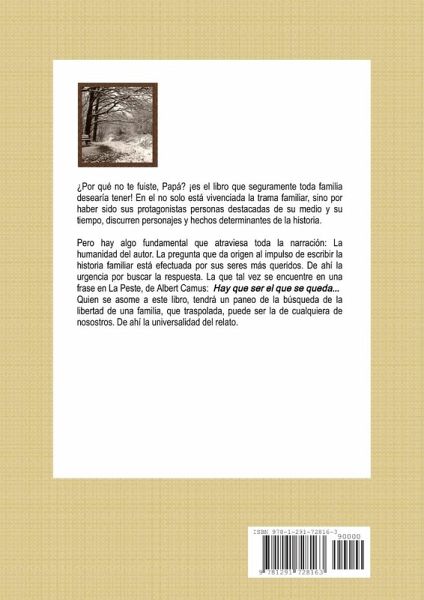 ¿Por qué no te fuiste, Papá? ¡es el libro que seguramente toda familia desearía tener! En el no solo está vivenciada la trama familiar, sino por haber sido sus protagonistas personas destacadas de su medio y su tiempo, discurren personajes y hechos determinantes de la historia. Pero hay algo fundamental que atraviesa toda la narración: La humanidad del autor. La pregunta que da origen al impulso de escribir la historia familiar está efectuada por sus seres más queridos. De ahí la urgencia por buscar la respuesta. La que tal vez se encuentre en una frase en La Peste, de Albert Camus: Hay que ser el que se queda... Quien se asome a este libro, tendrá un paneo de la búsqueda de la libertad de una familia, que traspolada, puede ser la de cualquiera de nosostros. De ahí la universalidad del relato.