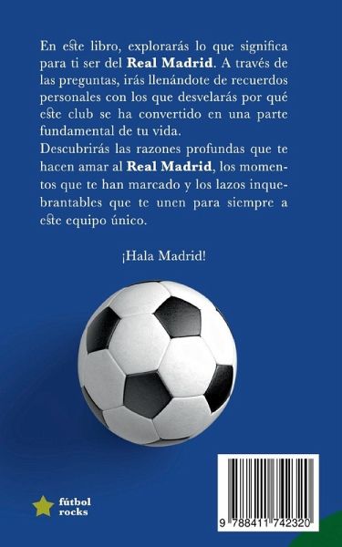¿Buscas un regalo original y emotivo para un seguidor del Real Madrid? ¡Lo has encontrado! En este libro, explorarás lo que significa para ti ser del Real Madrid. A través de las preguntas, irás llenándote de recuerdos personales con los que desvelarás por qué este club se ha convertido en una parte fundamental de tu vida. Descubrirás las razones profundas que te hacen amar al Real Madrid, los momentos que te han marcado y los lazos inquebrantables que te unen para siempre a este equipo único. Ser del Real Madrid trasciende la simple afición por un equipo de fútbol. No es una elección casual ni una mera preferencia deportiva. Es una pasión que late en lo más profundo del corazón, una lealtad inquebrantable que se hereda de generación en generación, una devoción que une a personas de todas las edades, razas y nacionalidades en una comunidad global. Ser del Real Madrid es más que un grito de celebración en los goles, más que la emoción en la victoria y el pesar en la derrota. Es un compromiso, un vínculo que se forja en los momentos de gloria y se fortalece en las horas difíciles. Es una historia de superación, de valentía y de perseverancia, que refleja los valores que tanto admiramos en el equipo. Bienvenido a un viaje emocional a través de los colores, la historia y la pasión que hacen del Real Madrid algo más que un club de fútbol. Este es un homenaje a todos los que llevamos el escudo en el pecho, a los que crecimos celebrando victorias y enfrentando derrotas con la cabeza en alto, a los que consideramos al Real Madrid una parte fundamental de nuestra identidad. Apropiado para madridistas de todas las edades que tengan al menos una pequeña historia de momentos vividos como apasionado seguidor del Real Madrid. Cuanta más historia vivida, más emocionante será el camino.
