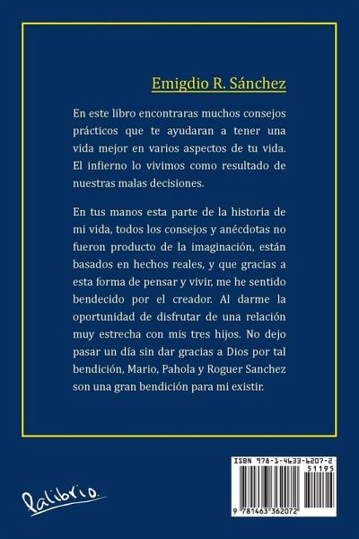 En este libro encontraras muchos consejos prácticos que te ayudaran a tener una vida mejor en varios aspectos de tu vida. El infierno lo vivimos como resultado de nuestras malas decisiones. En tus manos esta parte de la historia de mi vida, todos los consejos y anécdotas no fueron producto de la imaginación, están basados en hechos reales, y que gracias a esta forma de pensar y vivir, me he sentido bendecido por el creador. Al darme la oportunidad de disfrutar de una relación muy estrecha con mis tres hijos. No dejo pasar un día sin dar gracias a Dios por tal bendición, Mario, Pahola y Roguer Sanchez son una gran bendición para mi existir.