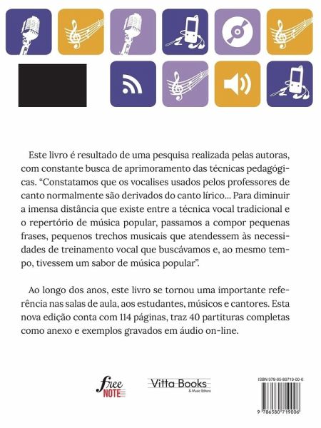 Este livro é resultado de uma pesquisa realizada pelas autoras, com constante busca de aprimoramento das técnicas pedagógicas. "Constatamos que os vocalises usados pelos professores de canto normalmente são derivados do canto lírico... Para diminuir a imensa distância que existe entre a técnica vocal tradicional e o repertório de música popular, passamos a compor pequenas frases, pequenos trechos musicais que atendessem às necessidades de treinamento vocal que buscávamos, e ao mesmo tempo tivessem um sabor de música popular." Ao longo dos anos, este livro se tornou uma importante referência nas salas de aula, aos estudantes, músicos e cantores. Esta nova edição conta com 114 páginas, traz 40 partituras completas como anexo, e exemplos gravados em áudio online. ACOMPANHA ÁUDIO ONLINE