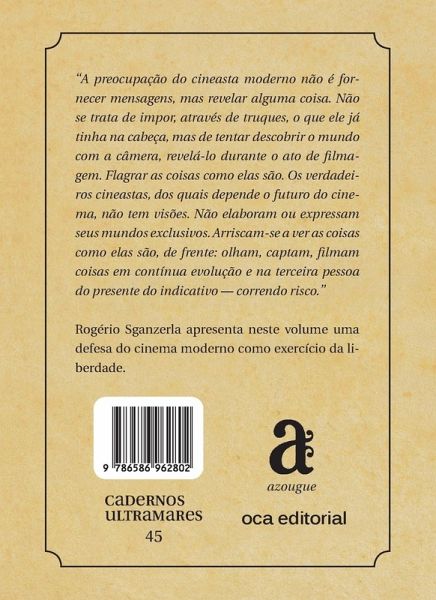 Cadernos Ultramares seeks to present Brazilian culture and thought in a qualified way, through volumes bringing together important essays by renowned authors in different areas of knowledge. Filmmaker Rogério Sganzerla, considered one of the biggest names in Brazilian cinema, presents in this volume, originally written in the mid-1960s, a defense of modern cinema as an exercise in freedom.
