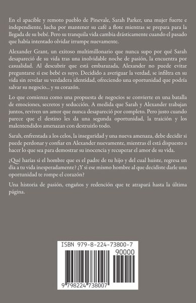 En el apacible y remoto pueblo de Pinevale, Sarah Parker, una mujer fuerte e independiente, lucha por mantener su café a flote mientras se prepara para la llegada de su bebé. Pero su tranquila vida cambia drásticamente cuando el pasado que había intentado olvidar irrumpe nuevamente. Alexander Grant, un exitoso multimillonario que nunca supo por qué Sarah desapareció de su vida tras una inolvidable noche de pasión, la encuentra por casualidad. Al descubrir que está embarazada, Alexander no puede evitar preguntarse si ese bebé es suyo. Decidido a averiguar la verdad, se infiltra en su vida sin revelar su verdadera identidad, ofreciendo una oportunidad que podría salvar su negocio... y su corazón. Lo que comienza como una propuesta de negocios se convierte en una batalla de emociones, secretos y seducción. A medida que Sarah y Alexander trabajan juntos, reviven un amor que nunca desapareció por completo. Pero justo cuando parece que el destino les da una segunda oportunidad, la traición y los malentendidos amenazan con destruirlo todo. Sarah, enfrentada a los celos, la inseguridad y una nueva amenaza, debe decidir si puede perdonar y confiar en Alexander nuevamente, mientras él está dispuesto a hacer lo que sea para demostrar su inocencia y recuperar el amor de su vida. ¿Qué harías si el hombre que es el padre de tu hijo y del cual huiste, regresa un dia a tu vida inesperadamente? ¿Y si ese mismo hombre al que decidiste darle una oportunidad te rompe el corazón? Una historia de pasión, engaños y redención que te atrapará hasta la última página.