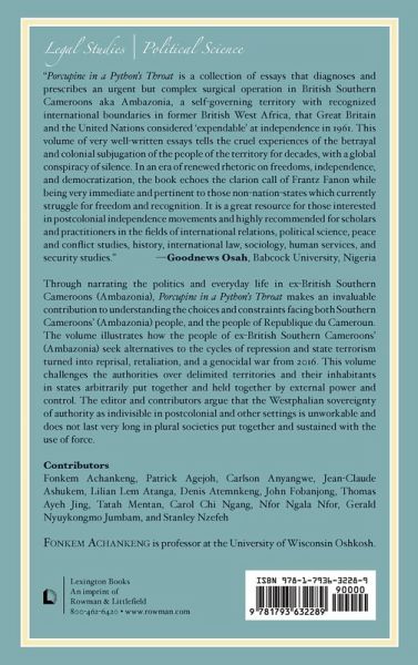 Through narrating the politics and everyday life in ex-British Southern Cameroons (Ambazonia), Porcupine in a Python’s Throatmakes an invaluable contribution to understanding the choices and constraints facing both Southern Cameroons’ (Ambazonia) people, and the people of Republique du Cameroun. The volume illustrates how the people of ex-British Southern Cameroons’ (Ambazonia) seek alternatives to the cycles of repression and state terrorism turned into reprisal, retaliation and a genocidal war from 2016. This volume challenges the authorities over delimited territories and their inhabitants in states arbitrarily put together and held together by external power and control. The editor and contributors argue that the Westphalian sovereignty of authority as indivisible in postcolonial and other settings is unworkable, and does not last very long in plural societies put together and sustained with the use of force.