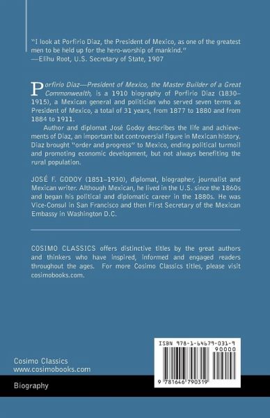 "I look at Porfirio Diaz, the President of Mexico, as one of the greatest men to be held up for the hero-worship of mankind." —Elihu Root, U.S. Secretary of State, 1907 Porfirio Diaz—President of Mexico, the Master Builder of a Great Commonwealth, is a 1910 biography of Porfirio Diaz (1830–1915), a Mexican general and politician who served seven terms as President of Mexico, a total of 31 years, from 1877 to 1880 and from 1884 to 1911. Author and diplomat José Godoy describes the life and achievements of Diaz, an important but controversial figure in Mexican history. Diaz brought "order and progress" to Mexico, ending political turmoil and promoting economic development, but not always benefiting the rural population.