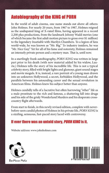 This is the hardback version. In the world of adult cinema, one name stands out above all others: John Holmes. For nearly 20 years, from 1967 to 1987, Holmes reigned as the undisputed king of X-rated lms, having appeared in a record 2,200 plus productions, from the landmark Johnny Wadd movies (one of which became the first adult motion picture to gross over $1 million) to the legendary Insatiable with Marilyn Chambers. To a legion of fans world-wide, he was known as "Mr. Big." To industry insiders, he was "Mr. Nice Guy." Yet for all of his fame and notoriety, Holmes remained an intensely private person and a mystery man. - that is, until now. In a startlingly frank autobiography, PORN KING was written in large part prior to his death (with new material added by his widow, Laurie). Holmes tells the story of his incredible life. This is not a typical celebrity story, filled with bright lights and glamour, giant sound stages and movie moguls. It is, instead, a rare portrait of a young man drawn into an unknown Hollywood, a secret, forbidden Hollywood, and the parallels between his astounding career and the sexual revolution in American films. Holmes knew his subject better than anyone. Holmes candidly tells of a lucrative but often harrowing "other" life as a male prostitute to the rich and famous, a shattering fall into drugs and his side of the grisly Wonderland Murders and his desperate crosscountry right afterwards. From start to finish, in this newly revised edition, complete with never-before-seen candid photos of Holmes in his private life, PORN KING is a sizzling, sensuous, fast-paced story laced with controversy. If ever there was an untold story, PORN KING is it.