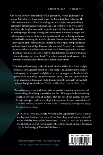 One of the foremost intellectuals of his generation, French philosopher of science Michel Serres (1930-2019) broke free from disciplinary dogmas. His reflections on science, culture, technology, art, and religion have proved foundational to scholars across the humanities. The contributors to Porous Becomings bring the inspirational and enigmatic world of Serres to the attention of anthropology. Through ethnographic encounters as diverse as angels and religious conversion in Ethiopia, the percolation of war in Bosnia, and incarcerated bodies crossing the Atlantic, the contributors showcase how Serres's interrogation of the fundamentals of human existence opens new pathways for anthropological knowledge. Proposing the notion of "porosity" to characterize permeability across boundaries of time, space, literary genre, and academic discipline, they draw on Serres to map the constellations that connect humans, time, technology, and planet Earth. The volume concludes with a conversation between the editors and Vibrant Matter author Jane Bennett. Contributors. Andreas Bandak, Jane Bennett, Tom Boylston, Steven D. Brown, Matei Candea, Alberto Corsín Jiménez, David Henig, Michael Jackson, Daniel M. Knight, Celia Lowe, Morten Nielsen, Stavroula Pipyrou, Elizabeth Povinelli, Andrew Shryock, Arpad Szakolczai