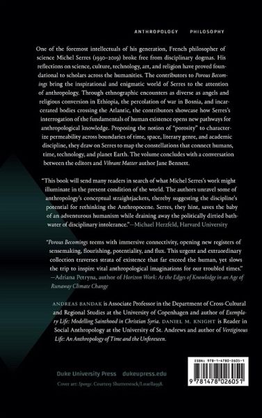 One of the foremost intellectuals of his generation, French philosopher of science Michel Serres (1930-2019) broke free from disciplinary dogmas. His reflections on science, culture, technology, art, and religion have proved foundational to scholars across the humanities. The contributors to Porous Becomings bring the inspirational and enigmatic world of Serres to the attention of anthropology. Through ethnographic encounters as diverse as angels and religious conversion in Ethiopia, the percolation of war in Bosnia, and incarcerated bodies crossing the Atlantic, the contributors showcase how Serres's interrogation of the fundamentals of human existence opens new pathways for anthropological knowledge. Proposing the notion of "porosity" to characterize permeability across boundaries of time, space, literary genre, and academic discipline, they draw on Serres to map the constellations that connect humans, time, technology, and planet Earth. The volume concludes with a conversation between the editors and Vibrant Matter author Jane Bennett. Contributors. Andreas Bandak, Jane Bennett, Tom Boylston, Steven D. Brown, Matei Candea, Alberto Corsín Jiménez, David Henig, Michael Jackson, Daniel M. Knight, Celia Lowe, Morten Nielsen, Stavroula Pipyrou, Elizabeth Povinelli, Andrew Shryock, Arpad Szakolczai
