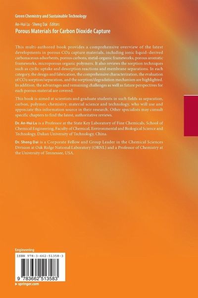 This multi-authored book provides a comprehensive overview of the latest developments in porous CO2 capture materials, including ionic liquid-derived carbonaceous adsorbents, porous carbons, metal-organic frameworks, porous aromatic frameworks, micro porous organic polymers. It also reviews the sorption techniques such as cyclic uptake and desorption reactions and membrane separations. In each category, the design and fabrication, the comprehensive characterization, the evaluation of CO2 sorption/separation and the sorption/degradation mechanism are highlighted. In addition, the advantages and remaining challenges as well as future perspectives for each porous material are covered.