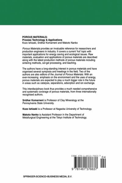 Approximately four million years of human history has passed. We have been using materials to make a variety of tools. The first materials used were naturally occurring materials such as animal bones, stones, wood etc.; and some of these familiar materials are porous. Porous materials are so familiar that they are sometimes forgotten or ignored. The taste experience of ice cream is created not only by adjusting ingre dients, but also by including air as an ingredient, i.e. pores that give the smooth texture of ice cream. This book is designed to describe and explain about pores, the synthesis of materials with pores (porous materials), and applications of porous materi als. This book is intended for engineers and scientists of different disciplines and specialities, and is expected to be useful in the design and synthesis of porous materials for existing as well as potential new applications. Let us rediscover pores. K. Ishizaki, S. Komameni and M. Nanko January 1998 1 Introduction 1.1 WHAT ARE POROUS MATERIALS? Porous materials are dermed as solids containing pores. Figure 1.1 shows different porous materials. Generally speaking, porous materials have a porosity of 0.2-0.95. The porosity means the fraction of pore volume to the total volume. Porous materials have been used in various applications from daily necessities, such as purifying drinking water by activated carbon or porous ceramics, to uses in modern industries, for example removing dusts from high purity process gases for semiconductor production.