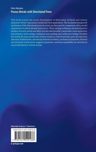 This book reviews the recent development of fabrication methods and various properties of lotus-type porous metals and their applications. The nucleation and growth mechanism of the directional pores in metals are discussed in comparison with a model experiment of carbon dioxide pores in ice. Three casting techniques are introduced to produce not only metals and alloys but also intermetallic compounds, semiconductors, and ceramics: mold casting, continuous zone melting, and continuous casting. The latter has merits for mass production of lotus metals to control porosity, pore size and pore direction. Furthermore, anisotropic behavior of elastic, mechanical properties, thermal and electrical conductivity, magnetic properties, and biocompatibility are introduced as peculiar features of lotus metals.