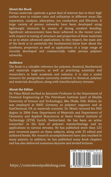 Porous materials captivate a great deal of interest due to their high surface area to volume ratio and utilization in different areas like separation, catalysis, adsorption, ion conduction and filtration. A large variety of porous networks have been developed using lightweight elements by means of strong covalent bonding. Significant advancements have been achieved in the recent years with respect to tuning of structure and properties of these materials so as to attain advanced applications. In this respect, the main aim of the book is to assimilate the fundamental know how about the synthesis, properties as well as applications of a large range of recently developed and commercially viable porous polymer networks. The book is a valuable reference for polymer, chemical, biochemical and materials engineers, as well as practicing scientists and researchers in both academia and industry. It is also a useful resource for postgraduate university students in chemical, polymer and materials disciplines, along with interdisciplinary streams. For more details, please visit https://centralwestpublishing.com