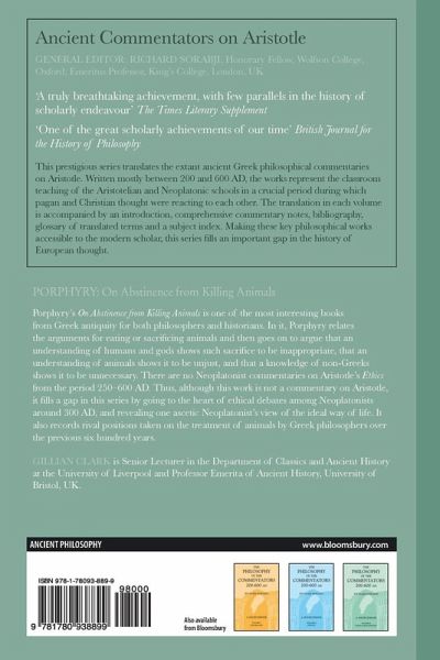 Porphyry's On Abstinence from Killing Animals is one of the most interesting books from Greek antiquity for both philosophers and historians. In it, Porphyry relates the arguments for eating or sacrificing animals and then goes on to argue that an understanding of humans and gods shows such sacrifice to be inappropriate, that an understanding of animals shows it to be unjust, and that a knowledge of non-Greeks shows it to be unnecessary. There are no Neoplatonist commentaries on Aristotle's Ethics from the period AD 250-600. Thus, although this work is not a commentary on Aristotle, it fills a gap in this series by going to the heart of ethical debates among Neoplatonists around AD 300, and revealing one ascetic Neoplatonist's view of the ideal way of life. It also records rival positions taken on the treatment of animals by Greek philosophers over the previous six hundred years.