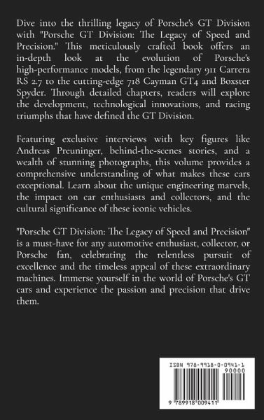 Dive into the thrilling legacy of Porsche's GT Division with "Porsche GT Division: The Legacy of Speed and Precision." This meticulously crafted book offers an in-depth look at the evolution of Porsche's high-performance models, from the legendary 911 Carrera RS 2.7 to the cutting-edge 718 Cayman GT4 and Boxster Spyder. Through detailed chapters, readers will explore the development, technological innovations, and racing triumphs that have defined the GT Division. Featuring exclusive interviews with key figures like Andreas Preuninger, behind-the-scenes stories, and a wealth of stunning photographs, this volume provides a comprehensive understanding of what makes these cars exceptional. Learn about the unique engineering marvels, the impact on car enthusiasts and collectors, and the cultural significance of these iconic vehicles. "Porsche GT Division: The Legacy of Speed and Precision" is a must-have for any automotive enthusiast, collector, or Porsche fan, celebrating the relentless pursuit of excellence and the timeless appeal of these extraordinary machines. Immerse yourself in the world of Porsche's GT cars and experience the passion and precision that drive them.