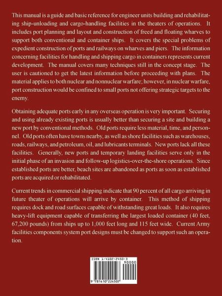 This manual is a guide and basic reference for engineer units building and rehabilitating ship-unloading and cargo-handling facilities in the theaters of operations. It includes port planning and layout and construction of freed and floating wharves to support both conventional and container ships. It covers the special problems of expedient construction of ports and railways on wharves and piers. The information concerning facilities for handling and shipping cargo in containers represents current development. The manual covers many techniques still in the concept stage. The user is cautioned to get the latest information before proceeding with plans. The material applies to both nuclear and nonnuclear warfare; however, in nuclear warfare, port construction would be confined to small ports not offering strategic targets to the enemy. Obtaining adequate ports early in any overseas operation is very important. Securing and using already existing ports is usually better than securing a site and building a new port by conventional methods. Old ports require less material, time, and personnel. Old ports often have towns nearby, as well as shore facilities such as warehouses, roads, railways, and petroleum, oil, and lubricants terminals. New ports lack all these facilities. Generally, new ports and temporary landing facilities serve only in the initial phase of an invasion and follow-up logistics-over-the-shore operations. Since established ports are better, beach sites are abandoned as ports as soon as established ports are acquired or rehabilitated. Current trends in commercial shipping indicate that 90 percent of all cargo arriving in future theater of operations will arrive by container. This method of shipping requires dock and road surfaces capable of withstanding great loads. It also requires heavy-lift equipment capable of transferring the largest loaded container (40 feet, 67,200 pounds) from ships up to 1,000 feet long and 115 feet wide. Current Army facilities components system port designs must be changed to support such an operation.