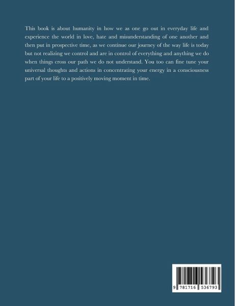 This book is about humanity in how we as one go out in everyday life and experience the world in love, hate and misunderstanding of one another and then put in prospective time, as we continue our journey of the way life is today but not realizing we control and are in control of everything and anything we do when things cross our path we do not understand. You too can fine tune your universal thoughts and actions in concentrating your energy in a consciousness part of your life to a positively moving moment in time.