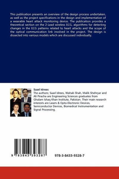 This publication presents an overview of the design process undertaken, as well as the project specifications in the design and implementation of a wearable heart attack monitoring device. The publication provides a theoretical section on the 2-Lead wireless ECG, algorithms for detecting changes in the ECG patterns related to heart attacks and the scope of the optical communication link involved in the project. The design is dissected into various models which are discussed individually.