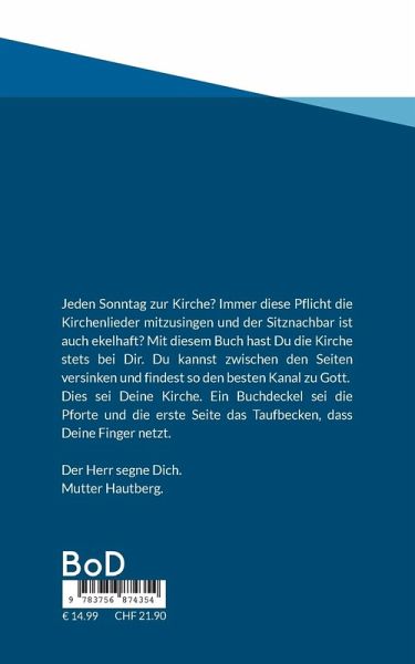 Jeden Sonntag zur Kirche? Immer diese Pflicht die Kirchenlieder mitzusingen und der Sitznachbar ist auch ekelhaft? Mit diesem Buch hast Du die Kirche stets bei Dir. Du kannst zwischen den Seiten versinken und findest so den besten Kanal zu Gott. Dies sei Deine Kirche. Ein Buchdeckel sei die Pforte und die erste Seite das Taufbecken, dass Deine Finger netzt. Der Herr segne Dich.Mutter Hautberg.