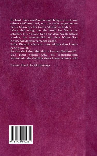 Richard, Fürst von Zantini und Halbgott, bricht mit seinen Gefährten auf, um die sechs sagenumwobenen Schwerter der Götter Aktirias zu finden.Diese sind nötig, um ein Portal ins Nichts zu schaffen. Nur so kann Kenn aus dem Nichts befreit werden, der versehentlich mit dem bösen Gott Kritzschak dorthin verbannt wurde. Sollte Richard scheitern, wäre Aktiria dem Untergang geweiht.Werden die Götter ihm ihre Schwerter überlassen?Was plant zudem Asta, die Hohepriesterin Kritzschaks, die ebenfalls ihren Herrn befreien will?Zweiter Band der Aktiria-Saga