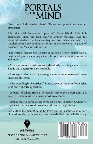 "See those little circles there? Those are portals to another dimension." After this wild declaration, 14-year-old Max's Weird Uncle Bob disappears. Then the teen receives strange messages over his electronic devices. He believes they are from his uncle, who has traveled beyond the boundaries of our known universe-a plane of existence that Max intends to visit. "The Portals" begins this eclectic collection of short fiction with a mixture of genres including science fiction, horror, fantasy, western, and more. - A man returns to consciousness with a slowly returning memory and a body that doesn't function normally. - A college student working overnight at a convenience store faces an unspeakable terror. - After attending his best friend's funeral, a young man confronts grief, guilt, and a ghostly apparition. - A band of killers track a desperado across the desert and to a deserted mission, where a final showdown ensues. - Strange music draws a young boy to an old mill in his town, where he is presented with a wondrous new world and a tough choice. Join author Stephen Wise as he takes you on a journey into new dimensions filled with magic, creatures in the dark, and self-discovery.
