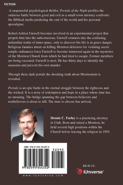 A suspenseful psychological thriller, Portals of the Night profiles the ominous battle between good and evil as a small-town attorney confronts the Biblical myths predicting the end of the world and his personal apocalypse. Robert Ashton Farwell becomes involved in an experimental project that propels him into the subconscious. Farwell ventures into the confusing, unfamiliar realm of inner-space, only to discover his life is in grave danger. Religious fanatics intent on killing Mormon defectors for violating secret temple ordinances force Farwell to become immersed again in the mysteries of the Mormon Church from which he had tried to escape. Former members are being executed. Farwell is next. He has thirty days to identify the assassins and prevent his own murder. Through these dark portals the shocking truth about Mormonism is revealed. Portals is an epic battle in the eternal struggle between the righteous and the wicked. It is a story of redemption and hope in a place where time has no meaning. The bridge spanning the gap between believers and nonbelievers is about to fall. The time to choose has arrived.