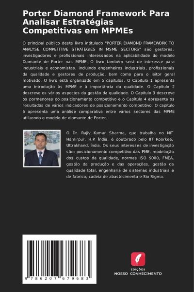 O principal público deste livro intitulado "PORTER DIAMOND FRAMEWORK TO ANALYSE COMPETITIVE STRATEGIES IN MSME SECTORS" são gestores, investigadores e profissionais interessados na aplicabilidade do modelo Diamante de Porter nas MPME. O livro também será de interesse para industriais e economistas, incluindo engenheiros industriais, profissionais da qualidade e gestores de produção, bem como para o leitor geral motivado. O livro está organizado em 5 capítulos. O Capítulo 1 apresenta uma introdução às MPME e à importância da qualidade. O Capítulo 2 descreve os vários aspectos da gestão da qualidade. O Capítulo 3 descreve os pormenores do posicionamento competitivo e o Capítulo 4 apresenta os resultados de vários indicadores de posicionamento competitivo. O capítulo 5 apresenta uma análise comparativa entre vários sectores das MPME utilizando o modelo de diamante de Porter.