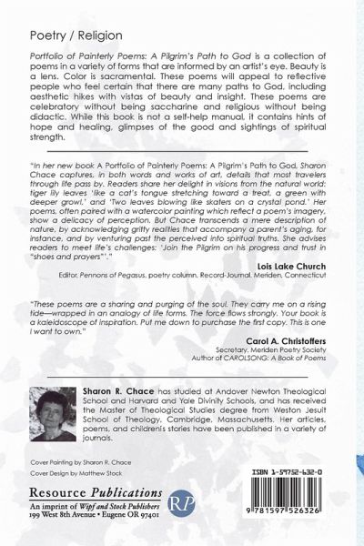 Portfolio of Painterly Poems: A Pilgrim's Path to God is a collection of poems in a variety of forms that are informed by an artist's eye. Beauty is a lens. Color is sacramental. These poems will appeal to reflective people who feel certain that there are many paths to God, including aesthetic hikes with vistas of beauty and insight. These poems are celebratory without being saccharine and religious without being didactic. While this book is not a self-help manual, it contains hints of hope and healing, glimpses of the good and sightings of spiritual strength.