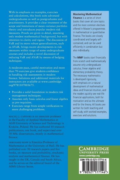 "With its emphasis on examples, exercises and calculations, this book suits advanced undergraduates as well as postgraduates and practitioners. It provides a clear treatment of the scope and limitations of mean-variance portfolio theory and introduces popular modern risk measures. Proofs are given in detail, assuming only modest mathematical background, but with attention to clarity and rigour. The discussion of VaR and its more robust generalizations, such as AVaR, brings recent developments in risk measures within range of some undergraduate courses and includes a novel discussion of reducing VaR and AVaR by means of hedging techniques. A moderate pace, careful motivation and more than 70 exercises give students confidence in handling risk assessments in modern finance. Solutions and additional materials for instructors are available at www.cambridge.org/9781107003675"--