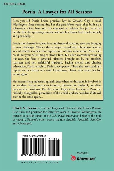 Forty-year-old Portia Fraser practices law in Cascade City, a small Washington State community. For the past fifteen years, she's built up a substantial client base and has managed to balance her job with her family. But the upcoming months will test her limits, both professionally and personally . Portia finds herself involved in a multitude of lawsuits, each one bringing its own challenge. When a sleazy lawyer named Seth Thompson hatches an evil scheme to cheat four orphans out of their inheritance, Portia calls on all her years of training to thwart him. But after successfully winning the case, she faces a personal dilemma brought on by her troubled marriage and her unfaithful husband. Facing mental and physical exhaustion, Portia travels to Paris to recuperate. There she meets and falls captive to the charms of a virile Frenchman, Henri, who makes her feel young again. Her month-long sabbatical quickly ends when her husband is involved in an accident. Portia returns to America, divorces her husband, and dives back into her workload. But she cannot forget those few days in Paris that radically changed her perception of the world, and she wonders if life will ever be the same again .