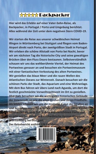 Hier wird das Erlebte auf einer Vater-Sohn-Reise, als Backpacker, in Portugal / Porto und Umgebung berichtet. Alles während der Zeit unter dem negativen Stern COVID-19. Wir starten die Reise aus unserer schwäbischen Heimat Illingen in Württemberg bei Stuttgart und fliegen vom Baden-Airport direkt nach Porto, der zweitgrößten Stadt in Portugal. Wir erleben die schöne Altstadt von Porto bei Nacht, bevor wir am nächsten Tag die historische City und seine gewaltigen Brücken über den Fluss Douro bestaunen. Selbstverständlich schauen wir uns das weltberühmte Viertel, der Heimat des Portweines genauer an und besuchen ein Portweinmuseum mit einer fantastischen Verkostung des alten Portweines. Wir genießen das blaue Meer und die rauen Wellen des Atlantischen Ozeans zur Winterzeit. Danach besuchen wir die schönen Parks der Stadt, das Aquarium und eine Wehranlage. Mit dem Bus fahren wir übers Land nach Agueda, um dort die festlich geschmückte Vorweihnachtszeit im Ort zu genießen. Abermals besuchen wir die wichtigsten historischen Gebäude der Innenstadt, so wie die alten Kirchen und deren Friedhöfe. Als letztes schauen wir uns die moderne Kunst der Straßen an und besuchen einen Park, so wie ein Kastell mit seiner Kirche. Dann endet die tolle Zeit in dem wunderschönen Porto und es geht wieder zurück in die schwäbische Heimat Illingen in Württemberg bei Stuttgart. Der Reisebericht enthält 126 Farbfotos.