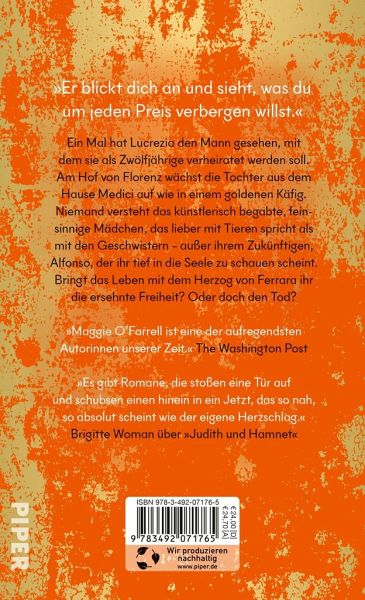 Ein Mal hat Lucrezia den Mann gesehen, mit dem sie als Zwölfjährige verheiratet werden soll. Am Hof von Florenz wächst die Tochter aus dem Hause Medici auf wie in einem goldenen Käfig. Niemand versteht das künstlerisch begabte, feinsinnige Mädchen, das lieber mit Tieren redet als mit den Geschwistern - außer ihrem Zukünftigen, Alfonso, der ihr tief in die Seele zu schauen scheint. Bringt das Leben mit dem Herzog von Ferrara ihr die ersehnte Freiheit? Oder doch den Tod?
