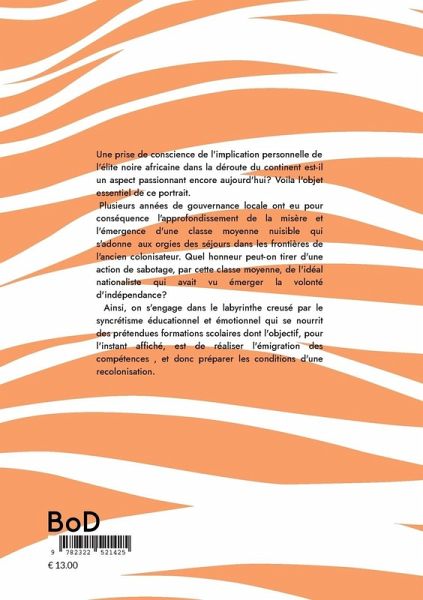 Une prise de conscience de l'implication personnelle de l'élite noire africaine dans la déroute du continent est-il un aspect passionnant encore aujourd'hui? Voila l'objet essentiel de ce portrait. Plusieurs années de gouvernance locale ont eu pour conséquence l'approfondissement de la misère et l'émergence d'une classe moyenne nuisible qui s'adonne aux orgies des séjours dans les frontières de l'ancien colonisateur. Quel honneur peut-on tirer d'une action de sabotage, par cette classe moyenne, de l'idéal nationaliste qui avait vu émerger la volonté d'indépendance? Ainsi, on s'engage dans le labyrinthe creusé par le syncrétisme éducationnel et émotionnel qui se nourrit des prétendues formations scolaires dont l'objectif, pour l'instant affiché, est de réaliser l'émigration des compétences , et donc préparer les conditions d'une recolonisation.