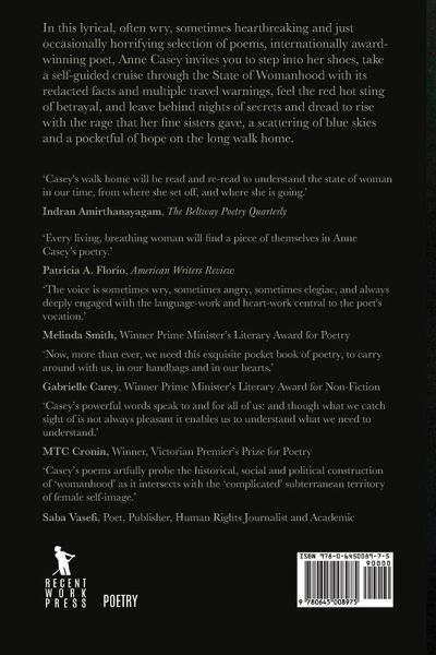 In this lyrical, often wry, sometimes heartbreaking and just occasionally horrifying selection of poems, internationally award-winning poet, Anne Casey invites you to step into her shoes, take a self-guided cruise through the State of Womanhood with its redacted facts and multiple travel warnings, feel the red hot sting of betrayal, and leave behind nights of secrets and dread to rise with the rage that her fine sisters gave, a scattering of blue skies and a pocketful of hope on the long walk home.
