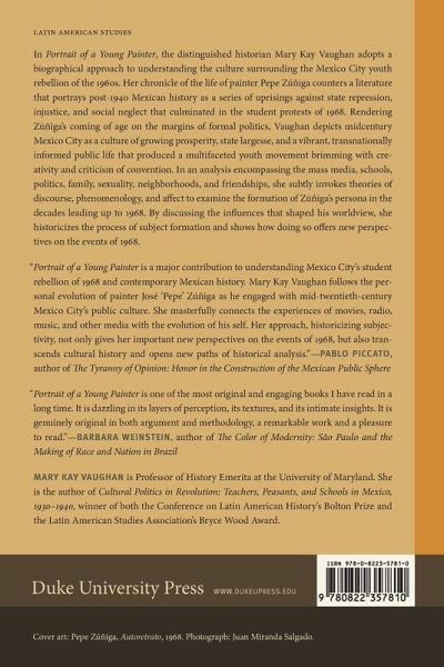 In Portrait of a Young Painter, the distinguished historian Mary Kay Vaughan adopts a biographical approach to understanding the culture surrounding the Mexico City youth rebellion of the 1960s. Her chronicle of the life of painter Pepe Zúñiga counters a literature that portrays post-1940 Mexican history as a series of uprisings against state repression, injustice, and social neglect that culminated in the student protests of 1968. Rendering Zúñiga's coming of age on the margins of formal politics, Vaughan depicts midcentury Mexico City as a culture of growing prosperity, state largesse, and a vibrant, transnationally-informed public life that produced a multifaceted youth movement brimming with creativity and criticism of convention. In an analysis encompassing the mass media, schools, politics, family, sexuality, neighborhoods, and friendships, she subtly invokes theories of discourse, phenomenology, and affect to examine the formation of Zúñiga's persona in the decades leading up to 1968. By discussing the influences that shaped his worldview, she historicizes the process of subject formation and shows how doing so offers new perspectives on the events of 1968.