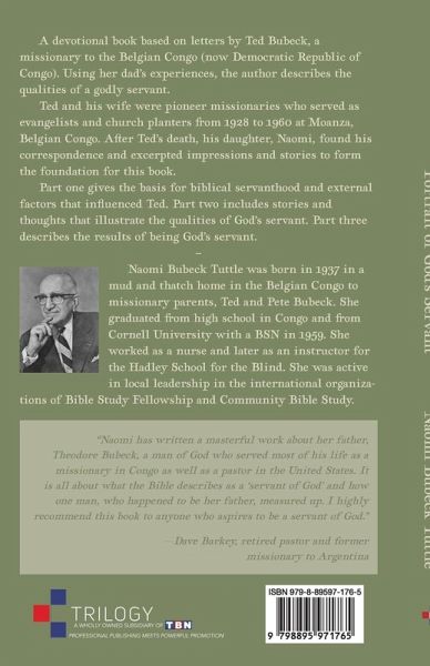 A devotional book based on letters by Ted Bubeck, a missionary to the Belgian Congo (now Democratic Republic of Congo). Using her dad's experiences, the author describes the qualities of a godly servant. Ted and his wife were pioneer missionaries who served as evangelists and church planters from 1928 to 1960 at Moanza, Belgian Congo. After Ted's death, his daughter, Naomi, found his correspondence and excerpted impressions and stories to form the foundation for this book. Part one gives the basis for biblical servanthood and external factors that influenced Ted. Part two includes stories and thoughts that illustrate the qualities of God's servant. Part three describes the results of being God's servant. "Naomi has written a masterful work about her father, Theodore Bubeck, a man of God who served most of his life as a missionary in Congo as well as a pastor in the United States. It is all about what the Bible describes as a 'servant of God' and how one man, who happened to be her father, measured up. I highly recommend this book to anyone who aspires to be a servant of God." -Dave Barkey, retired pastor and former missionary to Argentina