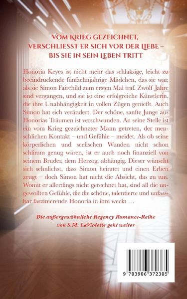 Vom Krieg gezeichnet, verschließt er sich vor der Liebe – bis sie in sein Leben tritt Die außergewöhnliche historische Romance-Reihe geht aufregend weiter Honoria Keyes ist nicht mehr das schlaksige, leicht zu beeindruckende fünfzehnjährige Mädchen, das sie war, als sie Simon Fairchild zum ersten Mal traf. Zwölf Jahre sind vergangen, und sie ist eine erfolgreiche Künstlerin, die ihre Unabhängigkeit in vollen Zügen genießt. Auch Simon hat sich verändert. Der schöne, sanfte Junge aus Honorias Träumen ist verschwunden. An seine Stelle ist ein vom Krieg gezeichneter Mann getreten, der menschlichen Kontakt – und Gefühle – meidet. Es wäre Wahnsinn sich erneut in Simon zu verlieben, doch Honorias Herz hatte schon immer seinen eigenen Willen. Als ob seine körperlichen und seelischen Wunden nicht schon schlimm genug wären, ist Simon Fairchild auch noch finanziell von seinem Bruder, dem Duke, abhängig. Dieser wünscht sich sehnlichst, dass Simon heiratet und einen Erben zeugt – doch Simon hat nicht die Absicht, das zu tun. Womit er allerdings nicht gerechnet hat, sind all die ungewollten Gefühle, die die schöne, talentierte und unfassbar faszinierende Honoria in ihm wecken würde … Alle Teile der Reihe können unabhängig voneinander gelesen werden. Weitere Titel in der Reihe Melodie zweier Herzen Eine leidenschaftliche Regency Romance (ISBN: 9783968174150) Unberechenbare Herzen Eine leidenschaftliche Regency Romance (ISBN: 9783968174211) Ein Herz für den Earl Eine leidenschaftliche Regency Romance (ISBN: 9783690904322) Das unerreichbare Herz der Lady Eine leidenschaftliche Regency Romance (ISBN: 9783690902755) Erste Leser:innenstimmen „Leidenschaftliche Romantik und echte Gefühle – einfach wundervoll!" „Meine aktuell liebste Regency Romance Reihe überzeugt vor allem durch liebenswerte, authentische Charaktere." „Liebe, Spannung, Erotik … diesem historischen Liebesroman fehlt es an nichts!" „herzergreifende und fesselnd erzählte Liebesgeschichte"