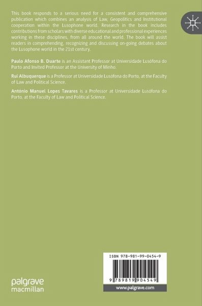 Introduction.- Part I: Legal issues and Politics within the Lusophone World.- Chapter 1. The Feasibility of the Portuguese Legal System in the Former African Colonies.- Chapter 2. The onto-anthropological foundation of Criminal Law in Brazil.- Chapter 3. Base Erosion and Profit Shifting: a view of Portugal and Brazil.- Chapter 4. Economic Law: a focus on Lusophone Competition Laws.- Chapter 5. The Role and Influence of Portuguese Law in the Macau SAR of the People's Republic of China: Issues and Perspectives.- Chapter 6. The Pillars of Portuguese Foreign Policy: From the first globalization to the 21st century. -Chapter 7. Reframing Portuguese Foreign Policy after 1974: The Lusophone Discourse as Instrument of a Global Coloniality of Power.- Chapter 8. Portugal and China Geopolitics: Avenues to Cooperation.- Part II. The Atlantic and the Lusophone World.- Chapter 9. China, Portugal and the Atlantic: the Shifting Geopolitics, by Jorge Tavares da Silva, Paulo Afonso B. Duarteand Rui Pereira.- Chapter 10. Lusophone Connections and China's Growing Presence in the South Atlantic.- Chapter 11. "So much sea": opportunities and challenges in Portugal-Brazil maritime cooperation.- Chapter 12. Lusophone cooperation frameworks and the expansion of the Atlantic Maritime Security.- Chapter 13. The Spatial Development Initiatives: The Case of African Portuguese Speaking Countries.- Chapter 14. Brazil´s reach out to Africa.- Chapter 15. The nativist movement in Angola: a proposal for a modern state and society in the Lusophone context.- Chapter 16. Cabo Verde´s Geopolitical Position in the Mid-Atlantic.- Chapter 17. Mozambique Geopolitics in the Lusophone World: Challenges and Perspectives.- Chapter 18. Luso-Mozambican Diplomatic Cooperation in the Case of the Terrorist Conflict in Cabo Delgado.- Chapter 19. Lusophone Geopolitics: Blue Economy and Maritime Security in Contemporary Mozambique's Geopolitics.- Part III. Influence and Institutional cooperation in the Lusophone World.- Chapter 20. The Geopolitics of the Portuguese Language: Knowledge and Influence.- Chapter 21. The Portuguese Science Diplomacy and EU's External Activities with Lusophone Africa: Looking at the Co-Building Approach.- Chapter 22. The Nets that Empires Weave: The Commonwealth of Nations and the Community of Portuguese-Speaking Countries.- Chapter 23. The Soft Power of the Community of Portuguese Speaking Countries.- Chapter 24. Wavering cooperation: Portugal and Lusophone Africa at the United Nations General Assembly.- Chapter 25. Transition to a New Geopolitics of Energy: the Lusophone World.- Chapter 26. The Role of Forum Macao in the People's Republic of China Foreign Policy.- Chapter 27. The Geopolitics of Timor-Leste: Belt & Road Initiative, ASEAN and CPLP.