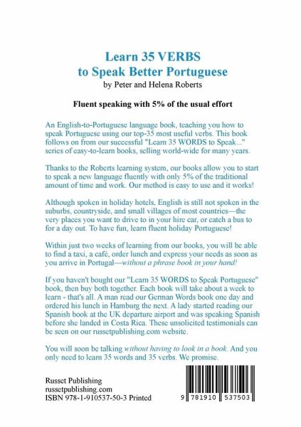 This book follows on from "PORTUGUESE Learn 35 WORDS to speak Portuguese". But it can be used as an independent book if you are already familiar with a limited vocabulary of nouns. This book requires only 5% of the effort usually expended in learning grammar and provides you with the facility to use the essential 35 VERBS to allow you to communicate your requirements in fluent holiday language with perfectly understandable pronunciation. By identifying what you really need to know for your holidays in any Portuguese-speaking holiday destination, we turn a two-year study into a two-week study, with better results! You will be able to speak what you learn and communicate immediately to Portuguese nationals, increasing your holiday fun and enjoyment immensely.