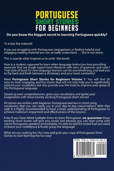Do you know the biggest secret to learning Portuguese quickly? To enjoy the material! If you are struggling with Portuguese conjugations or finding helpful and engaging reading material you can actually understand ... You're not alone. This is exactly our inspiration to write this book! Let's be honest, how is a student supposed to learn when language instructors love providing materials that are tough expert-level literature with tons of grammar and rules? That style of book for new language learners can be overwhelming, and lead you to flip back and forth between a dictionary and your book constantly! Not an effective use of your time nor the best way to learn. Meet Portuguese Stories for Beginners: You will find 20 easy-to-read, engaging, and fun stories that will not only help you to significantly expand your vocabulary but also provide you the tools to improve your grasp of the Brazilian Portuguese language. Speed up your comprehension, grow your vocabulary and ignite your imagination with these twenty exciting Portuguese short stories! All stories are written with beginner Portuguese learners in mind using vocabulary that you could easily use in your day-to-day conversations. With that said, it is highly recommended to have a basic understanding of Brazilian Portuguese to achieve maximum enjoyment and effectiveness of the lessons. This program is excellent for those who want to get an introduction to the language or brush up on their Portuguese language skills. How to Read Portuguese Short Stories for Beginners:Each story contains an important lesson in the Portuguese language involving an interesting and entertaining story with realistic dialogues and day-to-day situations. A summary in Portuguese and in English of what you just read, both to review the lesson and for you to gauge your comprehension of what the tale was about. At the end of those summaries, you'll be provided with a list of vocabulary found in the lesson, as well as phrases that you may not have understood the first time! Finally, you'll be given clever questions in Portuguese, so you can prove that you learned something in the stories. Even if you have failed multiple times to learn Portuguese, we guarantee these exciting short stories will give you words and phrases you can start using with native Brazilian Portuguese speakers immediately. It's time to add the rocket fuel you need to boost your confidence & finally grasp the language! What are you waiting for? Scroll back up and click "Add to Cart" to start learning Brazilian Portuguese the fun way!