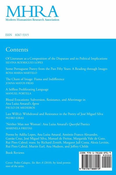The present special issue of Portuguese Studies has as its focus Portuguese poetry from the latter part of the twentieth century to our actual present. This poetry figures here in various ways, most directly with the section containing a brief anthology of texts from some of contemporary Portuguese poetry's most significant authors. And of course the collection of critical essays that engage with the various issues and problematics that have marked this poetry, including a continuous experimentation in terms of form, media, and intermediality. Added to this we also have six reviews of recent books and journals that allow for yet another view of our subject's vibrancy.