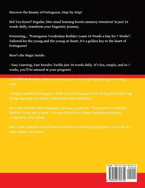 Unlock the mysteries of Portuguese with 'Portuguese Vocabulary Builder: Learn 10 Words a Day for 7 Weeks.' This meticulously crafted guide is suitable for both beginners and language enthusiasts, offering a transformative language learning experience.Based on scientific research supporting the effectiveness of bite-sized learning for memory retention, this book introduces 10 Portuguese words daily, each paired with its English counterpart and pronunciation. The structured exercises and clear format ensure that even beginners can make a flying start in their language journey.Beyond vocabulary, the book celebrates Portuguese culture and history, providing a deeper understanding of this vibrant language. It's not just a book; it's your passport to a vibrant Portuguese adventure, offering a quick and effective way to master Portuguese, 10 words at a time. Don't delay your linguistic dreams any longer; start your journey of learning Portuguese now!