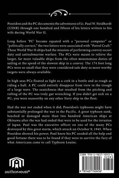 Poseidon and the PC documents the adventures of Lt. Paul W. Neidhardt (USNR) through one hundred and fifteen of his letters written to his wife during World War II. Long before 'PC' became equated with a "personal computer" or "politically correct," the two letters were associated with "Patrol Craft." These World War II ships had the mission of performing convoy escort duty and antisubmarine warfare. The PCs were meant to relieve the larger, far more valuable ships from the often monotonous duties of sailing at the speed of the slowest ship in a convoy. The 174 foot long PCs were so small that they were considered safe duty as more worthy targets were always available. In high seas PCs floated as light as a cork in a bottle and as rough as riding a bull. A PC could entirely disappear from view in the trough of a large wave. The seasickness that resulted from the pitching and rolling of the PC was truly gut wrenching. If you didn't get sick on a PC, you were seaworthy on any other Navy ship in the fleet. Had the war not ended when it did, Poseidon's typhoons might have substantially prolonged the war in the Pacific. A great typhoon sunk, beached or damaged more than two hundred American ships at Okinawa after the war had ended that were to be used for the invasion of Japan. Paul was the executive officer on one of the many PCs destroyed by this great storm, which struck on October 9, 1945. When Poseidon showed his power, Paul knew his PC needed all the help and good fortune there was to be found if they were to survive the fury of what Americans came to call Typhoon Louise.