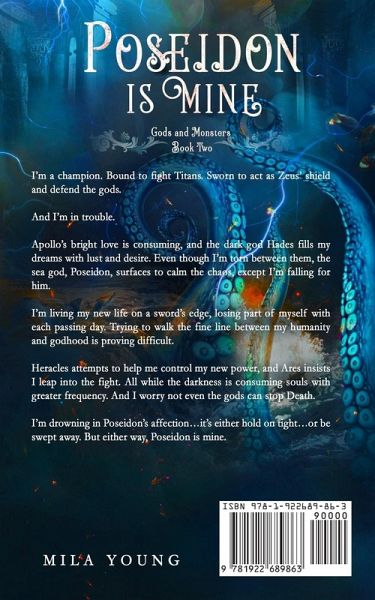 I'm a champion. Bound to fight Titans. Sworn to act as Zeus' shield and defend the gods. And I'm in trouble. Apollo's bright love is consuming, and the dark god Hades fills my dreams with lust and desire. Even though I'm torn between them, the sea god, Poseidon, surfaces to calm the chaos, except I'm falling for him. I'm living my new life on a sword's edge, losing part of myself with each passing day. Trying to walk the fine line between my humanity and godhood is proving difficult. Heracles attempts to help me control my new power, and Ares insists I leap into the fight. All while the darkness is consuming souls with greater frequency. And I worry not even the gods can stop Death. I'm drowning in Poseidon's affection...it's either hold on tight...or be swept away. But either way, Poseidon is mine.