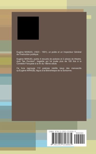 Recueil de 112 poésies inédites d'Eugène MANUEL, poéte de la fin du 19éme siécle, auteur "des OUVRIERS". Ces poésies sont issues des manuscrits légués à la biliothèque de La Sorbonne.
