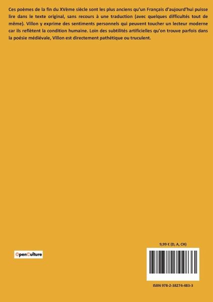 Ces poèmes de la fin du XVème siècle sont les plus anciens qüun Français d¿aujourd¿hui puisse lire dans le texte original, sans recours à une traduction (avec quelques difficultés tout de même). Villon y exprime des sentiments personnels qui peuvent toucher un lecteur moderne car ils reflètent la condition humaine. Loin des subtilités artificielles qüon trouve parfois dans la poésie médiévale, Villon est directement pathétique ou truculent.