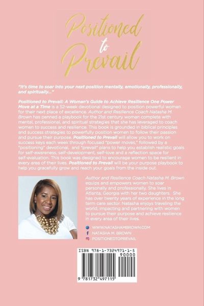 "It's time to soar into your next position mentally, emotionally, professionally, and spiritually..." Positioned to Prevail: A Woman's Guide to Achieve Resilience One Power Move at a Time is a 52-week devotional designed to position powerful women for their next place of excellence. Author and Resilience Coach Natasha M. Brown has penned a playbook for the 21st-century woman complete with mental, professional, and spiritual strategies that she has leveraged to coach women to success and resilience. This book is grounded in biblical principles and success strategies to powerfully position women to follow their passion and pursue their purpose. Positioned to Prevail will allow you to work on success keys each week through focused "power moves," followed by a "positioning" devotional, and "prevail" plans to help you establish realistic goals for self-awareness, self-development, self-love and a reflection space for self-evaluation. This book was designed to encourage women to be resilient in every area of their lives. Positioned to Prevail will be your purpose playbook to help you gracefully grow and reach your goals from the inside out.