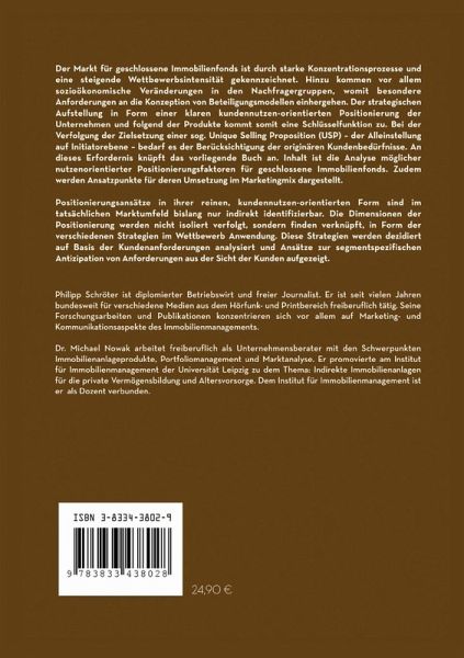 Der Markt für geschlossene Immobilienfonds ist durch starke Konzentrationsprozesse und eine steigende Wettbewerbsintensität gekennzeichnet. Hinzu kommen vor allem sozioökonomische Veränderungen in den Nachfragergruppen, womit besondere Anforderungen an die Konzeption von Beteiligungsmodellen einhergehen. Der strategischen Aufstellung in Form einer klaren kundennutzen-orientierten Positionierung der Unternehmen und folgend der Produkte kommt somit eine Schlüsselfunktion zu. Bei der Verfolgung der Zielsetzung einer sog. Unique Selling Proposition (USP) ¿ der Alleinstellung auf Initiatorebene ¿ bedarf es der Berücksichtigung der originären Kun-denbedürfnisse. An dieses Erfordernis knüpft das vorliegende Buch an. Inhalt ist die Analyse möglicher nutzenorientierter Positionierungsfaktoren für geschlossene Immobilienfonds. Zudem werden Ansatzpunkte für deren Umsetzung im Marketingmix dargestellt. Positionierungsansätze sind im tatsächlichen Marktumfeld bislang nur indirekt identifizierbar. Die Dimensionen der Positionierung werden nicht isoliert verfolgt, sondern finden verknüpft Anwendung. Eine Betrachtung der verschiedenen Strategien innerhalb des Wettbewerbsumfelds ist somit unabdingbar.