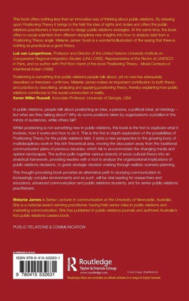 This book presents a new framework for intentional strategic positioning in public relations. It is a significant move away from the symmetrical communication ideas that have dominated public relations thinking for several decades. Whilst positioning is not something new in public relations, this book is the first to explicate what it involves, how it works and how to do it.