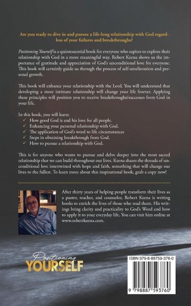 Are you ready to dive in and pursue a life-long relationship with God regardless of your failures and breakthroughs? Positioning Yourself is a definitive book for everyone who aspires to explore their relationship with God more meaningfully. Robert Keena shows us the importance of gratitude and appreciation for God's unconditional love for everyone. This book will undoubtedly guide us through the process of self-amelioration and personal growth. This book will enhance your relationship with the Lord. You will understand that developing a more intimate relationship will change your life forever. Applying these principles will position you to receive breakthroughs/successes from God in your life. In this book, you will learn: How good God is and his love for all people. Enhancing your relationship with God. The application of God's word to life circumstances Steps in obtaining breakthrough from God. How to pursue a relationship with God. This is for anyone who wants to pursue and delve deeper into the most sacred relationship we can build throughout our lives. Keena shares the threads of unconditional love intertwined with hope and faith, something that will change our lives to the fullest. To learn more about this inspirational book, grab a copy now!